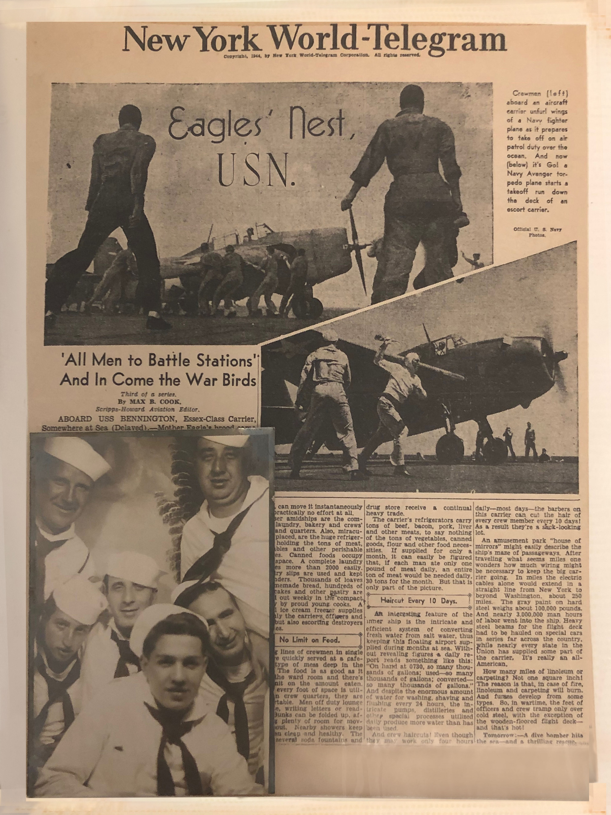The Greatest Generation – This photo is of my father and his buddies on the aircraft carrier, CV 20 the USS Bennington during World War II. The crewman aboard the Eagles Nest, USN, (plane) were preparing to take off on air patrol over the Pacific Ocean in 1944.